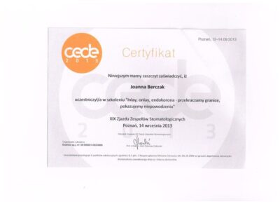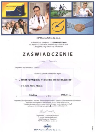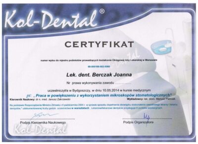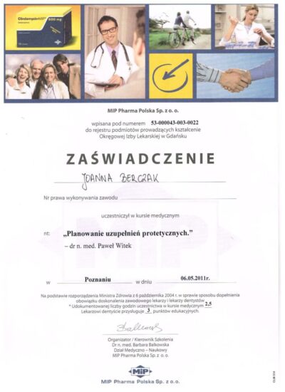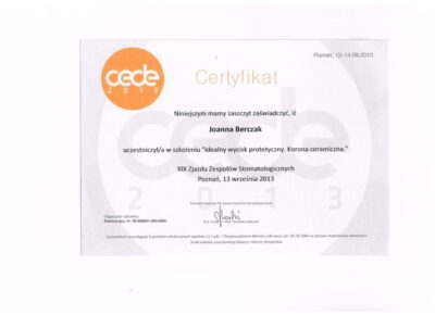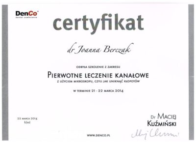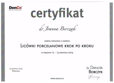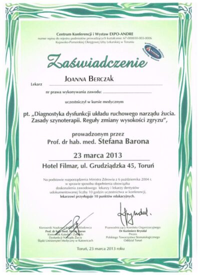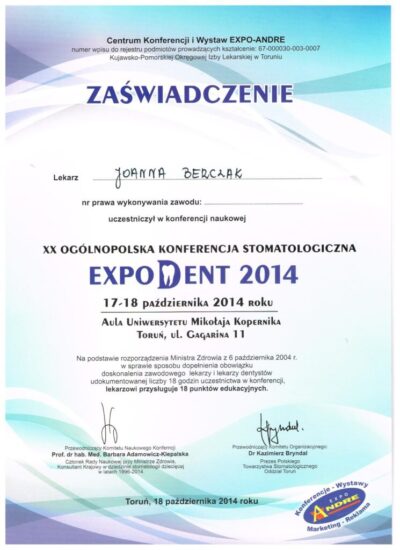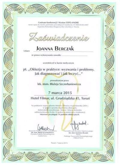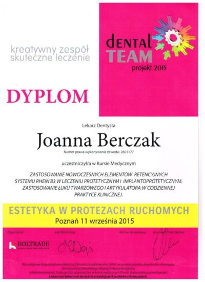 Specjalista protetyki stomatologicznej. Absolwentka Uniwersytetu Medycznego im. Karola Marcinkowskiego w Poznaniu. Lekarz dla którego estetyka uśmiechu oraz bezstresowe leczenie jest priorytetem. Współpraca z najlepszymi technikami dentystycznymi i wieloletnie doświadczenie w protetyce pozwala jej osiągać doskonałe, pod względem estetycznym jak i funkcjonalnym efekty lecznicze. Jej szczególnym zainteresowaniem w protetyce estetycznej są licówki porcelanowe, korony i mosty oraz prace precyzyjne. Jej specjalnością są również choroby stawów skroniowo- żuchwowych, które z powodzeniem leczy od wielu lat.